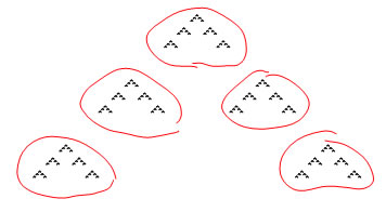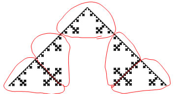 5A. For the circled similar part of this Sierpinski triangle, tell the scale factor needed to enlarge it to the whole triangle, and the number of copies needed to create the whole triangle.