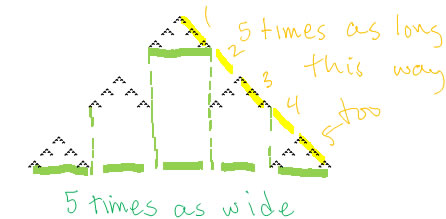 If you circle pieces that are this size, then it take 5 of them to make the whole thing (n=5) and the scale factor is 5 (S=5)--the whole thing is 5 times as long.