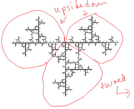 The hardest thing about this fractal is finding the smaller pieces, because if you want the biggest ones, all of them are rotated from the directing in the big one. Here's how it works for the biggest pieces you could find:
