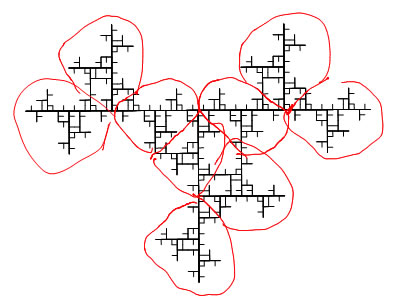 7. In this fractal, circle a piece that is at the same shape as the whole thing, but at a different magnification. For your piece, tell how much (length scale factor) you would need to magnify it to get the whole thing (S), and how many of them it takes to make the whole thing (N). Then tell what dimension this fractal is, or what dimensions it is between.