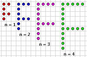 Notice that I have the n-number (step number) in a box, and that the boxed numbers correspond to the dots I circled. The goal in doing this is to emphasize how the growing part of the pattern in the picture corresponds to how the numbers grow.